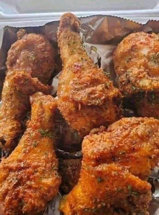 If you bite a slice of this fried chicken, the crunchy sound is a song for the heart. This meal is well worth the greasy, burned fingers.