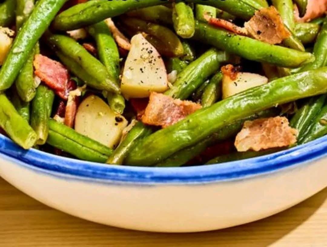 Add the trimmed green beans to the pot and pour in the chicken broth. Stir everything together and bring to a gentle simmer.